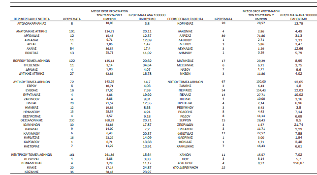 Τα νέα εργαστηριακά επιβεβαιωμένα κρούσματα της νόσου που καταγράφηκαν τις τελευταίες 24 ώρες είναι 1.449, εκ των οποίων 11 εντοπίστηκαν κατόπιν ελέγχων στις πύλες εισόδου της χώρας. Ο συνολικός αριθμός των κρουσμάτων ανέρχεται σε 254.031 (ημερήσια μεταβολή +0.6%), εκ των οποίων 51.5% άνδρες. Με βάση τα επιβεβαιωμένα κρούσματα των τελευταίων 7 ημερών, 55 θεωρούνται σχετιζόμενα με ταξίδι από το εξωτερικό και 2.605 είναι σχετιζόμενα με ήδη γνωστό κρούσμα.