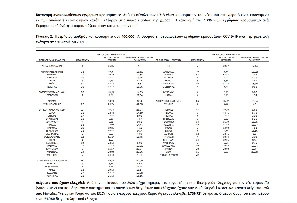 Η σημερινή ανακοίνωση του ΕΟΔΥ: Τα νέα εργαστηριακά επιβεβαιωμένα κρούσματα της Covid-19 είναι 1.718, εκ των οποίων 3 εντοπίστηκαν κατόπιν ελέγχων στις πύλες εισόδου της χώρας. Ο συνολικός αριθμός των κρουσμάτων ανέρχεται σε 295.480 (ημερήσια μεταβολή +0,6%), εκ των οποίων 51,4% άνδρες. Με βάση τα επιβεβαιωμένα κρούσματα των τελευταίων 7 ημερών, 63
