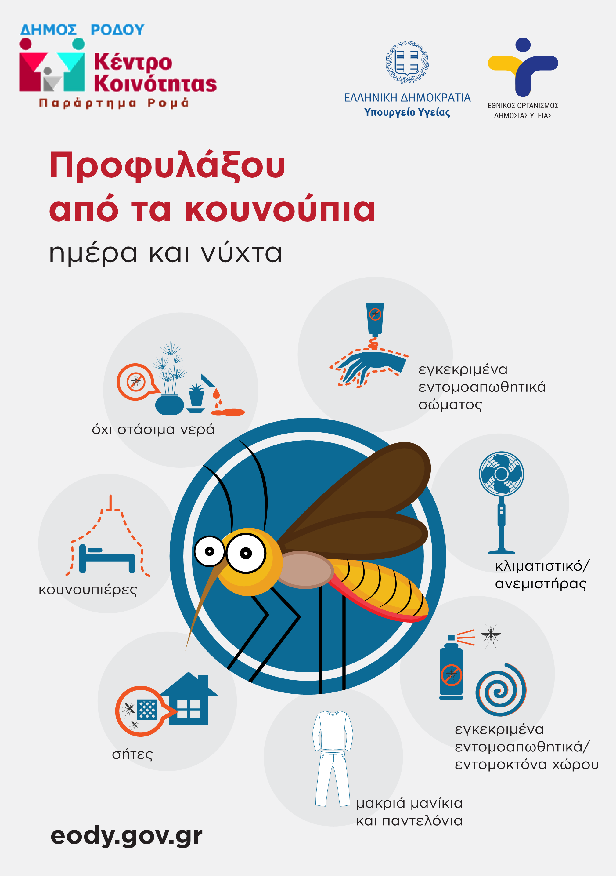 Στο πλαίσιο ενημέρωσης των πολιτών σχετικά με τα μέτρα προφύλαξης από τα κουνούπια και την πρόληψη νοσημάτων που μεταδίδονται από αυτά, ο κ. Γιώργος Τριάντος, αντιδήμαρχος Δημόσιας Υγείας και Κοινωνικής Πολιτικής μαζί με το Κέντρο Κοινότητας Δήμου Ρόδου με Παράρτημα Ρομά συστήνουν σε όλους να τηρούν τα μέτρα προστασίας, σύμφωνα με τις κατευθυντήριες οδηγίες του Εθνικού Οργανισμού Δημόσιας Υγείας (ΕΟΔΥ), που είναι τα παρακάτω:
