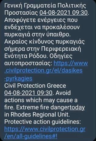Μέσω του 112 Greece ήρθε μήνυμα στα κινητά όσων κατοικούν στη Ρόδο απο τον υφυπουργό Πολιτικής Προστασίας Νίκο Χραδαλιά για τους μεγάλους κινδύνους για πυρκαγιά σήμερα στο νησί. Πιο συγκεκριμένα: -Ο Υφυπουργός Πολιτικής Προστασίας και Διαχείρισης Κρίσεων, Νίκος Χαρδαλιάς, σε σχετική δήλωσή του τονίζει: Καλούμε τους συμπολίτες μας σε πλήρη επαγρύπνηση και συναγερμό! Σε άμεση προληπτική λήψη μέτρων προστασίας της ζωής και της περιουσίας, αλλά και του φυσικού περιβάλλοντος σύμφωνα με τις οδηγίες της Γενικής Γραμματείας Πολιτικής Προστασίας (https://www.civilprotection.gr/el/dasikes-pyrkagies). Σε αποφυγή οποιασδήποτε δραστηριότητας ή ενέργειας που μπορεί να προκαλέσει εκδήλωση πυρκαγιάς! Σε διαρκή κινητοποίηση σε κάθε γειτονιά, σε κάθε χωριό, σε κάθε πόλη και άμεση ενημέρωση της Πυροσβεστικής Υπηρεσίας στον αριθμό 199 ή στο 112 αν αντιληφθούν καπνό ή φωτιά. Αύριο και τις επόμενες ημέρες επιβάλλεται να είμαστε όλοι ιδιαίτερα προσεκτικοί, όλοι παρόντες, όλοι σε εγρήγορση και κινητοποίηση! Το Πυροσβεστικό Σώμα και όλες οι δυνάμεις και οι εμπλεκόμενοι φορείς Πολιτικής Προστασίας της χώρας βρίσκονται σε πλήρη επιφυλακή.