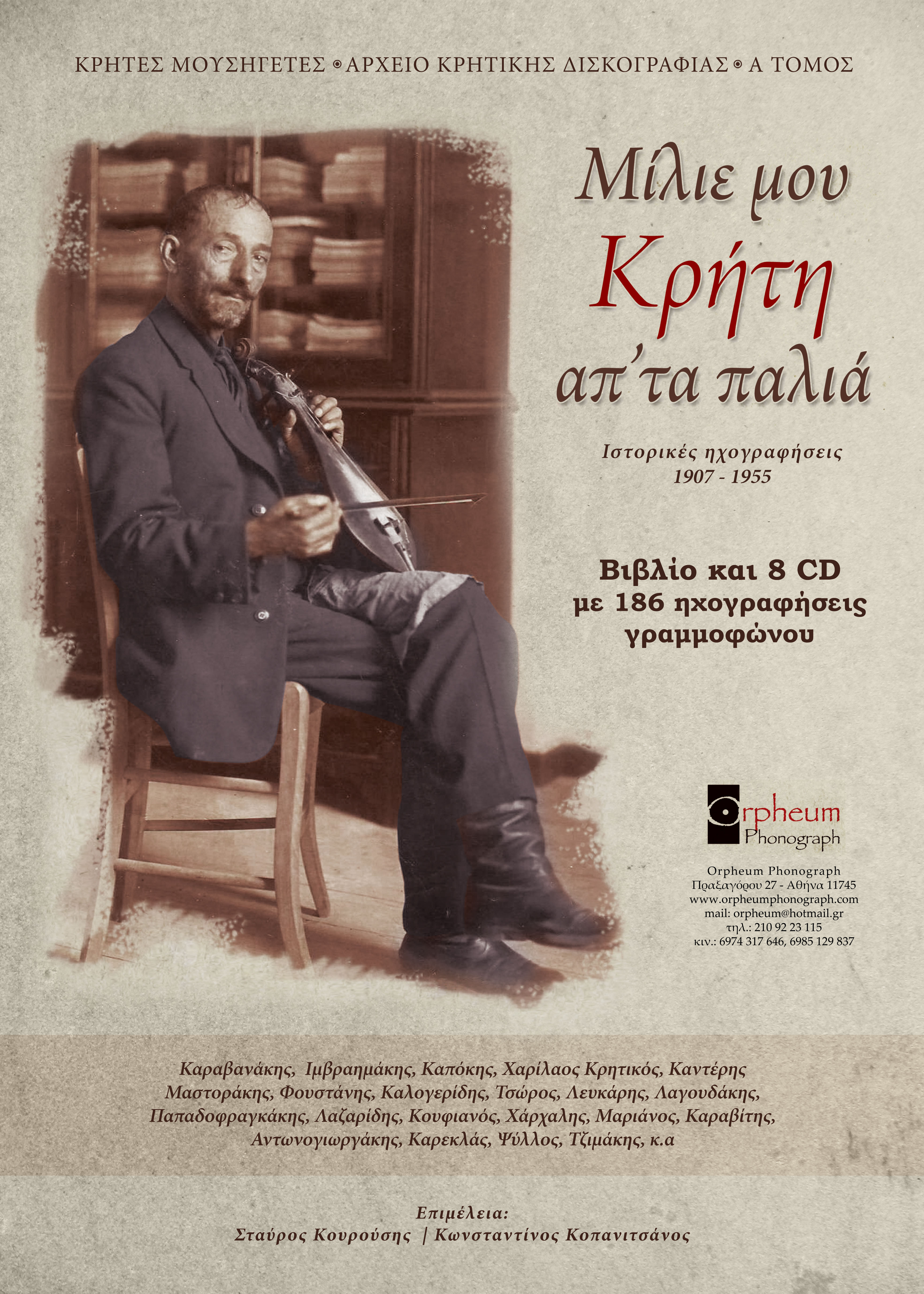 Μετά από πολυετείς προσπάθειες αναζήτησης των πρώτων ηχογραφήσεων κρητικής μουσικής, η εταιρεία Orpheum Phonograph παρουσιάζει τον πρώτο τόμο της σειράς ΚΡΗΤΕΣ ΜΟΥΣΗΓΕΤΕΣ με σπανιότατους δίσκους γραμμοφώνου της περιόδου 1907-1955, πολλοί από τους οποίους σώζονται σήμερα σε ένα και μόνο αντίτυπο! Για πρώτη φορά πραγματοποιείται ένα τόσο μεγάλο και πολύπλοκο εγχείρημα για την ιστορία της κρητικής μουσικής. Συγκεκριμένα, σε 8 CD παρουσιάζονται συνολικά 186 τραγούδια και σκοποί (το 92% αυτών δεν έχουν επανεκδοθεί έως σήμερα), μαζί με σημαντικές πληροφορίες για τις δισκογραφικές εταιρείες, αλλά και με πλούσια βιογραφικά στοιχεία των μουσικών που συμμετείχαν. Συνοπτικά στην έκδοση συμπεριλαμβάνονται: • Η πρώτη ηχογράφηση κρητικής μουσικής με το Κρητικό Νυφιάτικο από το Βαμιανό λυράρη Ιωάννη Καραβανάκη στα 1907, ο ύμνος της Κρητικής Πολιτείας, η πρώτη ηχογράφηση του Κρητικού Πηδηχτού από τον Τουρκοκρητικό κλαρινετίστα Ιμβραημάκη, τα πρώτα ταμπαχανιώτικα τραγούδια με τους Ν. Κουφιανό και Γ. Λαζαρίδη και οι 4 πρώτες εκτελέσεις του γνωστού ριζίτικου Πότε θα κάμει ξαστεριά. • Τα άπαντα της κρητικής δισκογραφίας στην Αμερική μεταξύ 1917-1926 με τους πρωτοπόρους λυράρηδες Καπόκη και Καντέρη αλλά και τον πρώτο ηχογραφημένο μουσικό της ανατολικής Κρήτης, τον Νικόλαο Μαστοράκη με τη μαντόλα του. •Τα άπαντα της προπολεμικής δισκογραφίας από τους θρυλικούς Φουστάνη, Μ. Λαγουδάκη, Καραβίτη, Μαριάνο, Χάρχαλη, Παπαδοφραγκάκη, Αντωνογιωργάκη, Λευκάρη και Ψύλλο. • Το μεγαλύτερο μέρος από το δισκογραφικό έργο του περίφημου λυράρη Νικόλαου Κουφιανού και των Αντώνη Παπαδάκη ή Καρεκλά και Στρατή Καλογερίδη. • Οι πρώτες ηχογραφήσεις του σπουδαίου Χαρίλαου Πιπεράκη μαζί με δύο ηχογραφήσεις του 1938 που δεν εκδόθηκαν ποτέ στην εποχή τους και που περιέχονται για πρώτη φορά ψηφιοποιημένες από τις σωζόμενες μήτρες της εταιρείας. Πρόκειται για μία ακριβέστατη καταγραφή των διαφορετικών μουσικών «ταυτοτήτων» της Κρήτης, με επίκεντρο την πρώιμη περίοδο της δισκογραφίας. Πολύτιμο είναι το ένθετο των 300 σελίδων που συνοδεύει την έκδοση, εμπεριέχει σπάνιο φωτογραφικό υλικό με ιστορικά και μουσικολογικά σχόλια από τους διακεκριμένους μουσικολόγους, καθηγητές πανεπιστημίου Μαρία Χναράκη και Γιάννη Ζαϊμάκη, καθώς και τους ερευνητές Αγησίλαο Αλιγιζάκη, Γιώργη Βαβουλέ, Γιάννη Χαρκούτση, Κώστα Κοπανιτσάνο, Σταύρο Κουρούση κ.ά.