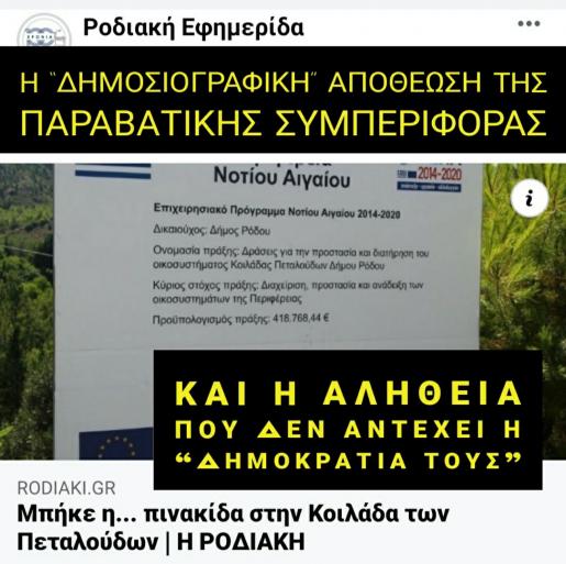 Αν η “έγκριτος” εφημερίδα “Ροδιακή” ήθελε να κάνει ρεπορτάζ, θα έπρεπε να είχε αναζητήσει ποιος έδωσε εντολή να ξηλωθεί η πινακίδα της ΕΕ από την είσοδο της Κοιλάδας των Πεταλούδων ( που αναπλάθεται από το Επιχειρησιακό Πρόγραμμα Νότιο Αιγαίο 2014 – 2020), τις ημέρες της φιέστας για τα εγκαίνια της ... εισόδου, για να μην δουν οι επισκέπτες ποιος είναι ο φορέας χρηματοδότησης του έργου της ανάπλασης της Κοιλάδας. Θα έπρεπε να είχε αναζητήσει και αποκαλύψει ποιοι είναι εκείνοι που λειτουργούν σαν τσιφλικάδες και δεν σέβονται ούτε κανόνες, ούτε νομικές, ούτε ηθικές δεσμεύσεις.
