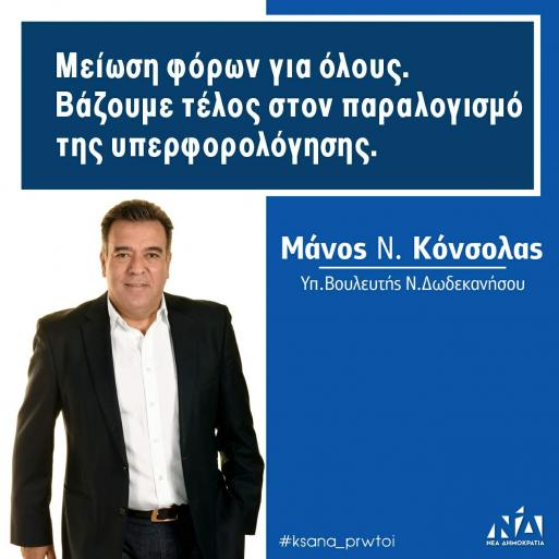 ΜΑΝΟΣ ΚΟΝΣΟΛΑΣ: «Μείωση φόρων για όλους. Βάζουμε τέλος στον παραλογισμό της υπερφορολόγησης»