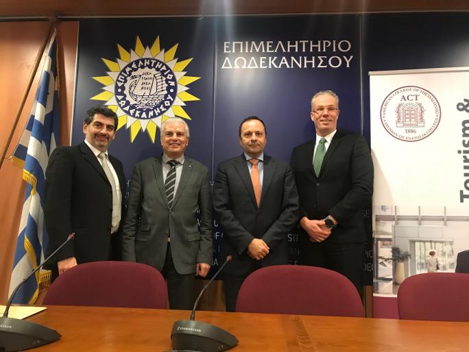 Από αριστερά: Δρ Νίκος Χουρβουλιάδης, Διευθυντής του Business School του ACT, Γιάννης Πάππους, Πρόεδρος του Επιμελητηρίου Δωδεκανήσου, Γιώργος Ματσίγκος, Πρόεδρος του Συλλόγου Διευθυντών Ξενοδοχείων Ρόδου, Ανέστης Αναστασίου, Υπεύθυνος Προγραμμάτων Τουρισμού του ACT