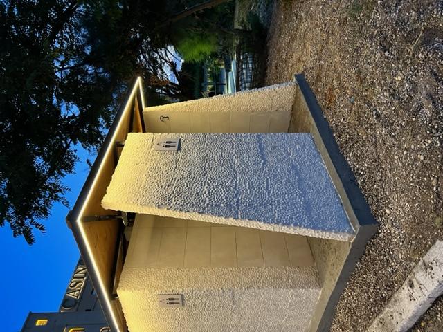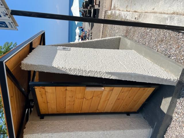 Η χρήση βοτσαλωτού σαν επένδυση των εξωτερικών επιφανειών, έγινε για δύο κυρίως λόγους, την εναρμόνιση των οικίσκων με το φυσικό περιβάλλον της παραλίας, καθώς επίσης και την προστασία των επιφανειών αυτών, από τη διάβρωση του θαλασσινής αύρας. Το “χτενιστό” σκυρόδεμα που χρησιμοποιήθηκε σαν βάση της κατασκευής, προσδίδει αντοχή έδρασης, αλλά και ένα δάπεδο αντοχής στις πολύ απαιτητικές συνθήκες χρήσης και περιβάλλοντος. Τέλος ο σκελετός της κατασκευής από γαλβανισμένη στράντζα, παρέχει προστασία από τη διάβρωση ενώ η επένδυση με ινοσανίδα, ενισχύει το επίπεδο προστασίας.