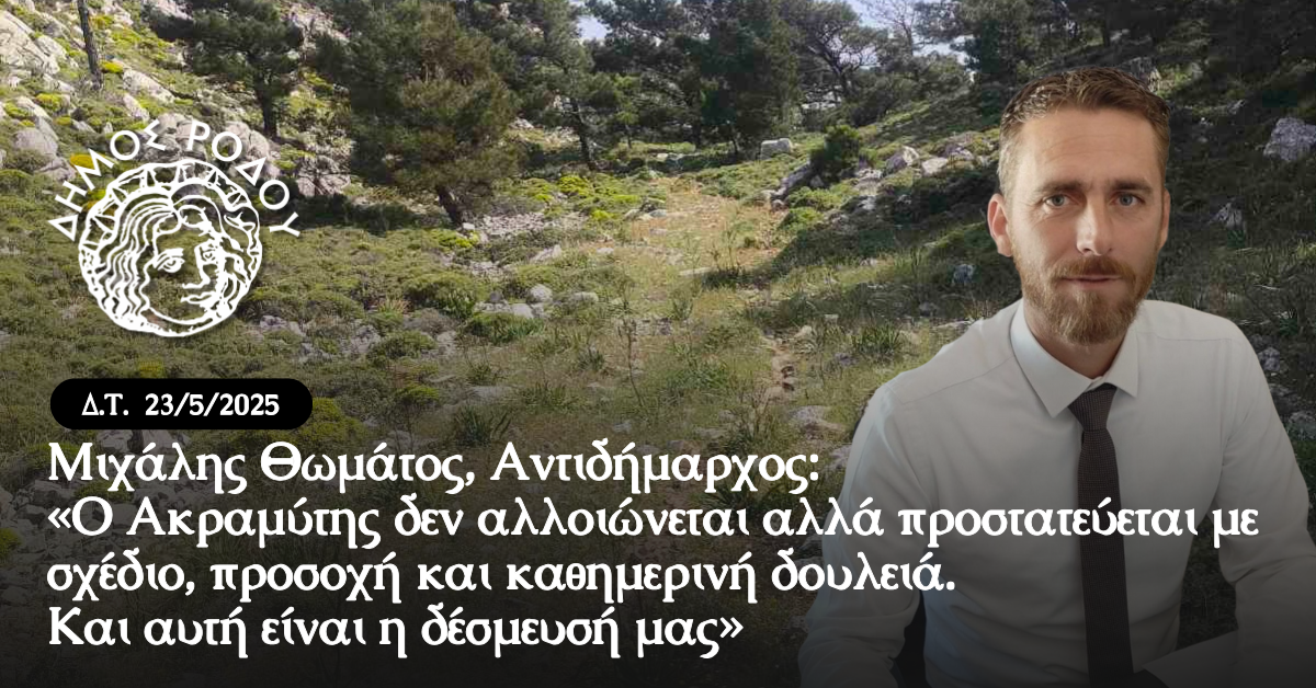 Ο Ακραμύτης και το δάσος της Κυμισάλαςείναι από τα πολυτιμότερα φυσικά τοπία της Ρόδου. Η προστασία τους αποτελεί προτεραιότητα για τον Δήμο Ρόδου και είναι ευθύνη όλων μας.