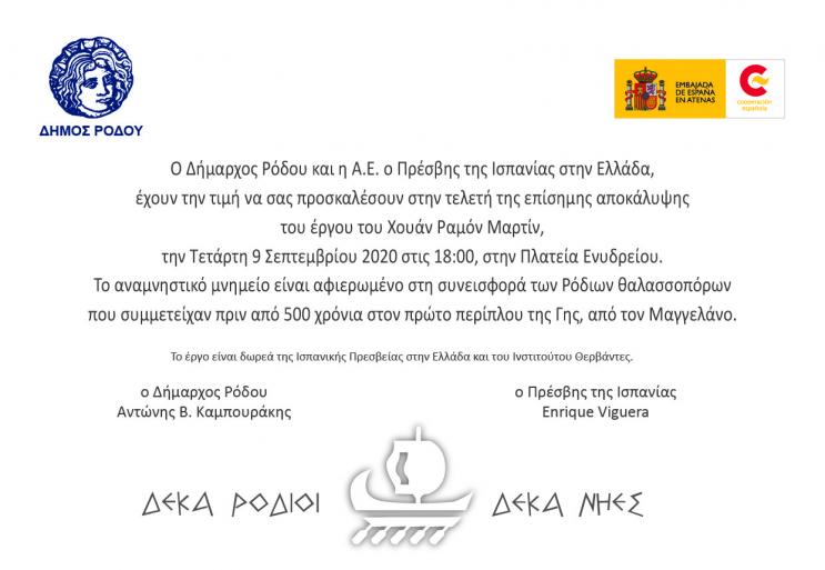 Για 2 ημέρες στη Ρόδο θα πραγματοποιηθούν εκδηλώσεις σχετικά με αυτό το γεγονός που θα περιλαμβάνουν στις 9 Σεπτεμβρίου 18:00 τα αποκαλυπτήρια του μνημείου στην περιοχή του Ενυδρείου και την Πέμπτη 10 Σεπτεμβρίου συζήτηση στρογγυλής τραπέζης και έκθεση φωτογραφίας στο κατάλυμα της Ισπανίας. Λόγω του covid-19 η συμμετοχή κοινού θα είναι με προσκλήσεις, όμως οι συμπολίτες μας μπορούν να το παρακολουθήσουν σε ζωντανή σύνδεση, μέσω της σελίδας του Δήμου Ρόδου στο Facebook.