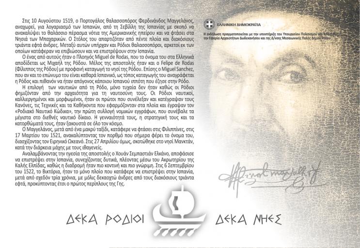18:00 Αποκαλυπτήρια μνημείου προς τιμή των Ελλήνων ναυτικών που συμμετείχαν στον πρώτο περίπλου της γης υπό τον Μαγγελάνο