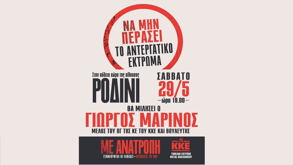 - Εκδήλωση- ομιλία στον αύλειο χώρο του Ροδινιού το Σάββατο 29 Μαΐου και ώρα 19:00 με τον Γιώργο Μαρίνο, μέλος του ΠΓ της ΚΕ του ΚΚΕ και βουλευτής.