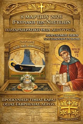 Tον Πολιούχο και προστάτη της Πάτμου Όσιο Χριστόδουλο το Λατρηνό εορτάζει την Κυριακή  8 Μαρτίου 2026 το πρωί ο φερώνυμος σύλλογος της Ρόδου. Με αφορμή την  εορτή του Συλλόγου Πατμίων Ρόδου « Ο Όσιος Χριστόδουλος» ,θα τελεσθεί Τρισαρχιερατική Θεία Λειτουργία  μετ’ αρτοκλασίας προεξάρχοντος του Σεβασμιωτάτου  Μητροπολίτου  Ρόδου κ.κ. Κυρίλλου  στον Ιερό Ναό Κοιμήσεως Θεοτόκου Ιαλυσού.