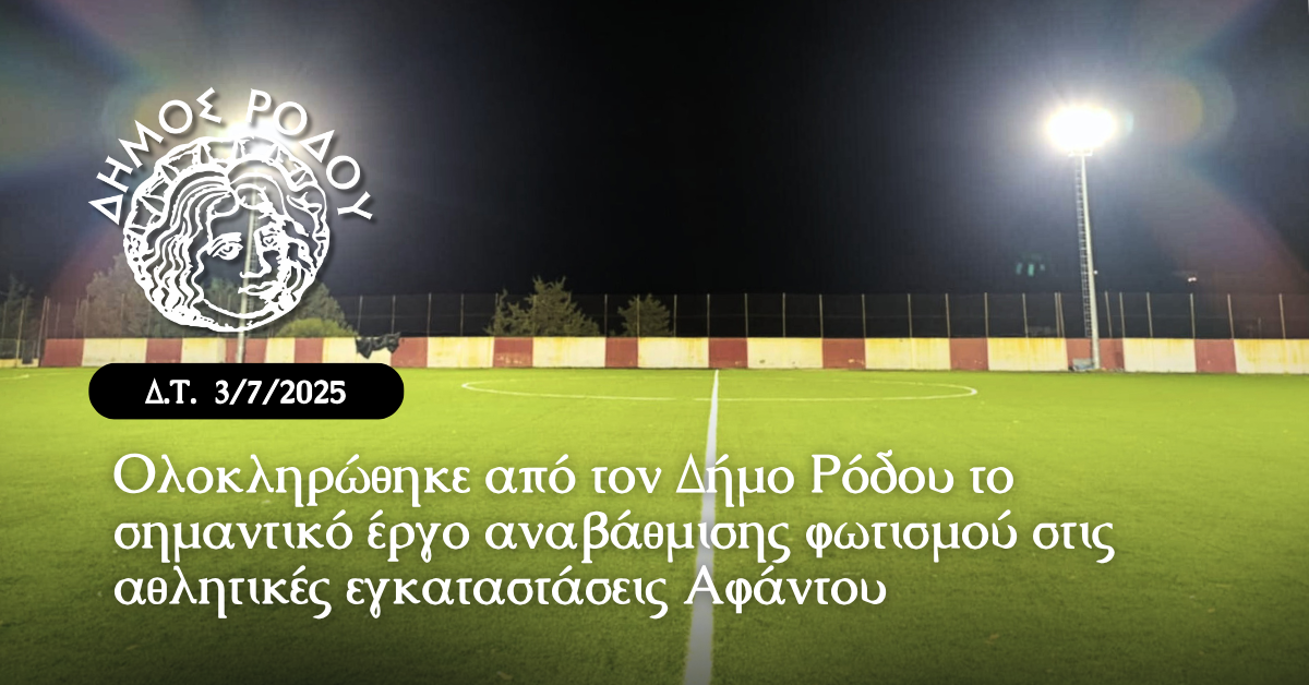 Ολοκληρώθηκε από τη Δημοτική Αρχή του Αλέξανδρου Κολιάδη το σημαντικό έργο «Βελτίωση Φωτισμού Αθλητικών Εγκαταστάσεων Δ.Ε. Αφάντου», με χρηματοδότηση από ίδιους πόρους του Δήμου Ρόδου.
