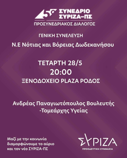 Ομιλία με τον βουλευτή και τομεάρχη Υγείας του ΣΥΡΙΖΑ Προοδευτική Συμμαχία Ανδρέα Παναγιωτόπουλο, θα πραγματοποιηθεί την Τετάρτη 28 Μαΐου στο ξενοδοχείο Πλάζα, στο κέντρο της Ρόδου, στις 20:00.