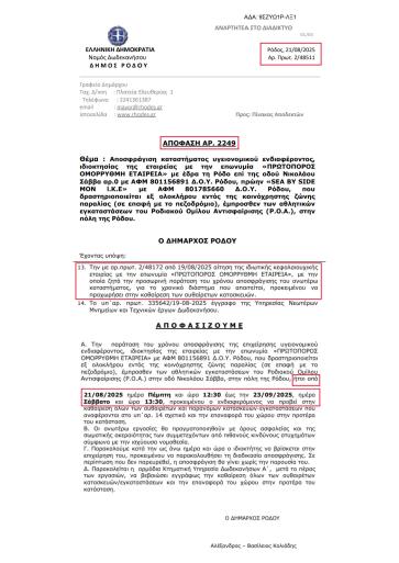 Για το Beach-BarAzulπρώην BAIA, ενώ υπήρχε απόφαση σφράγισης από τον Οκτώβριο του 2024 της Δημοτικής Επιτροπής του Δήμου Ρόδου, ο Δήμαρχος Ρόδου προχώρησε σε «προσωρινή αποσφράγιση» η οποία παρατάθηκε οκτώ φορές μέχρι την επικείμενη λήξη στις 23 Σεπτεμβρίου, που είχε ως αποτέλεσμα την παράνομη λειτουργία της επιχείρησης από την έναρξη της τουριστικής περιόδου έως σήμερα.