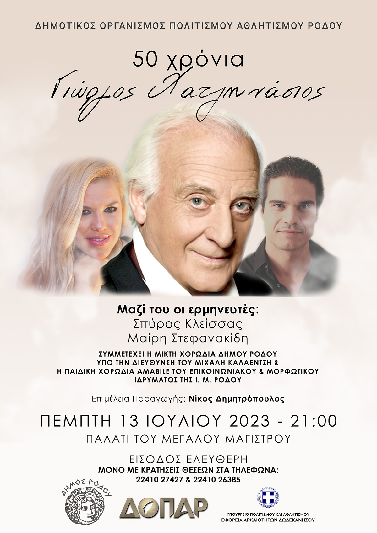 Σε ένα από τα πιο όμορφα και εμβληματικά μέρη του νησιού των Ιπποτών, στη ναυαρχίδα των Δωδεκανήσων, τη Ρόδο, θα βρεθεί ο πολυβραβευμένος διεθνούς φήμης μουσικοσυνθέτης της ποίησης και του έρωτα Γιώργος Χατζηνάσιος. Σε μια συναυλία στο Παλάτι του Μεγάλου Μαγίστρου που διοργανώνει ο Δήμος Ρόδου και ο ΔΟΠΑΡ με την στίρηξη της Εφορείας Αρχαιοτήτων Δωδεκανήσου, την Πέμπτη 13 Ιουλίου 2023 στις 21:00. Η είσοδος για το κοινό θα είναι ελεύθερη, αλλά μόνο με προκρατήσεις θέσεων στα τηλέφωνα: 22410 27427 & 22410 26385.