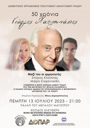 Έχοντας συμπληρώσει περισσότερο από μισό αιώνα παρουσίας στα πολιτιστικά δρώμενα της χώρας, πλαισιωμένος από 2 εκπληκτικούς ερμηνευτές που για περισσότερο από 15 χρόνια αποτελούν τους μόνιμους συνεργάτες του, τον Σπύρο Κλείσσα και την Μαίρη Στεφανακίδη, συμπράττει με τη Μικτή Χορωδία Δήμου Ρόδου, υπό τη διεύθυνση του μαέστρου της Μιχάλη Καλαεντζή, σε ένα 2ωρο μουσικό πρόγραμμα αναδρομής σε όλη τη σπουδαία καλλιτεχνική διαδρομή του. Συμμετέχει επίσης η παιδική χορωδία Amabile του επικοινωνιακού & μορφωτικού ιδρύματος της Ι. Μ. Ρόδου.