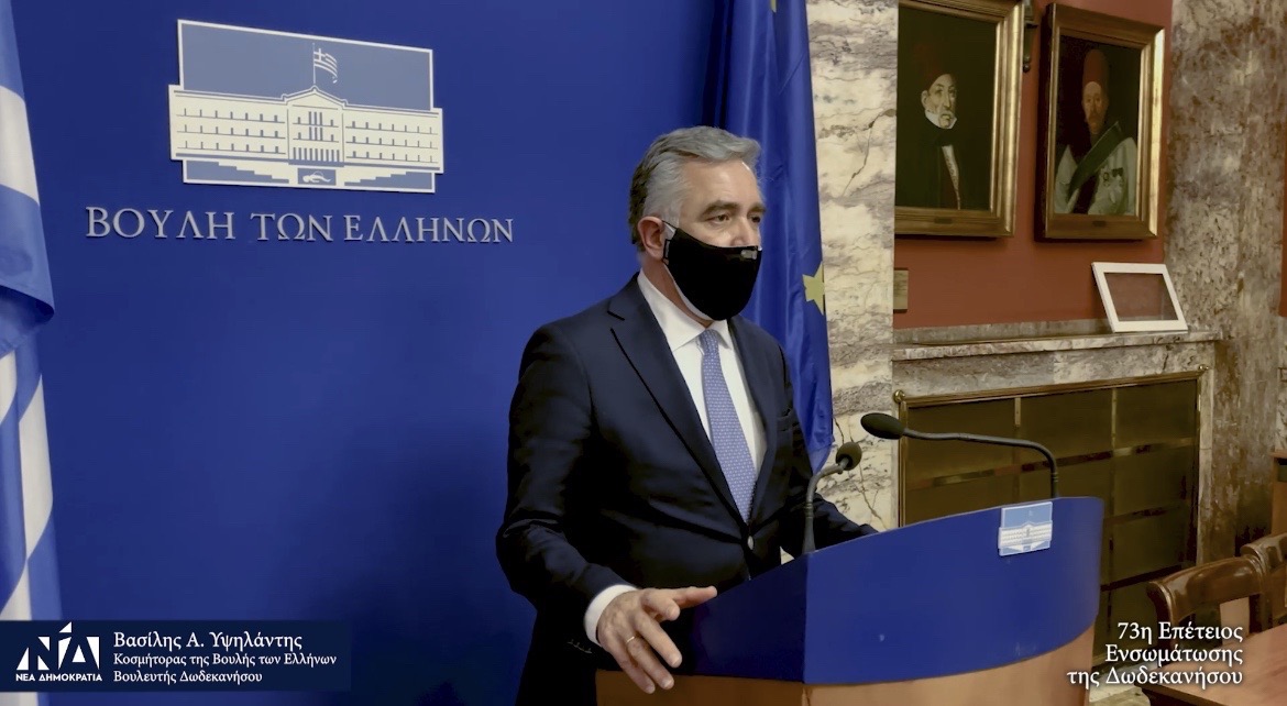- Ο Κοσμήτορας της Βουλής και Βουλευτής Δωδεκανήσου Βασίλειος Νικόλαος Α. Υψηλάντης θα εκπροσωπήσει τη Βουλή των Ελλήνων στην κατάθεση στεφάνου που  θα γίνει στη Ρόδο από την Πρόεδρο της Δημοκρατίας κ. Κατερίνα Σακελλαροπούλου με την ευκαιρία της 73ης Επετείου της Ενσωμάτωσης της Δωδεκανήσου στον Εθνικό κορμό.