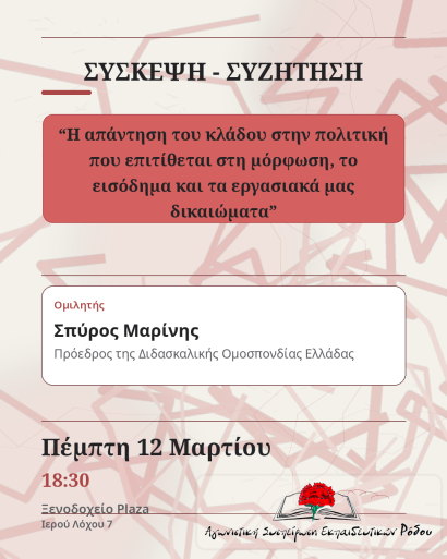 Αγωνιστική Συσπείρωση Εκπαιδευτικών Ρόδου διοργανώνει την Πέμπτη 12 Μαρτίου, στις