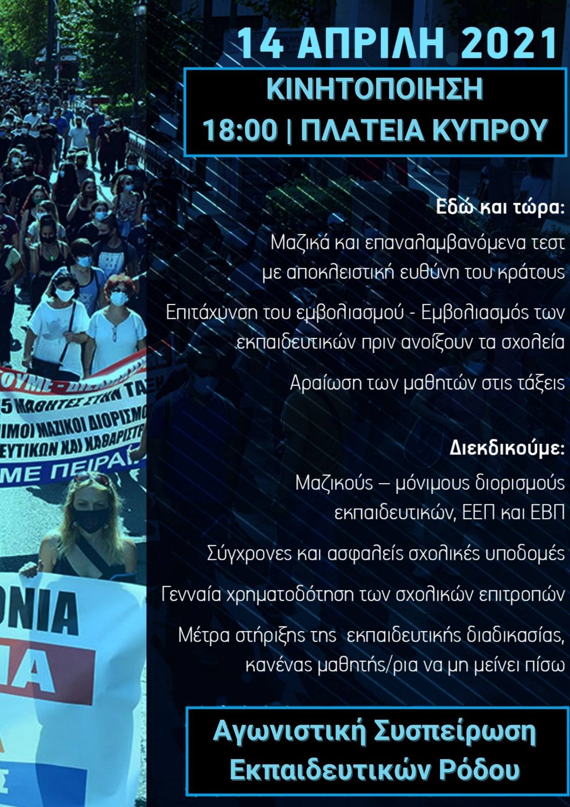 Η κυβέρνηση, με την εγκληματική της πολιτική, παίζει με την υγεία εκπαιδευτικών και γονέων, με την ψυχική υγεία και τα μορφωτικά δικαιώματα των μαθητών. Αξιοποίησε την πανδημία ως «ευκαιρία» για να νομοθετήσει σκληρά αντιεκπαιδευτικά μέτρα (αξιολόγηση, τρίμηνα, επαγγελματική εκπαίδευση, τράπεζα θεμάτων, αστυνομία στα πανεπιστήμια κ.α.). Δεν πήρε κανένα μέτρο για την ασφαλή λειτουργία των σχολείων από την αρχή της χρονιάς, με αποτέλεσμα να κλείσουν όλα τα σχολεία στις αρχές Νοέμβρη και αρκετά από αυτά να παραμένουν κλειστά για πέντε συνεχόμενους μήνες από τότε.