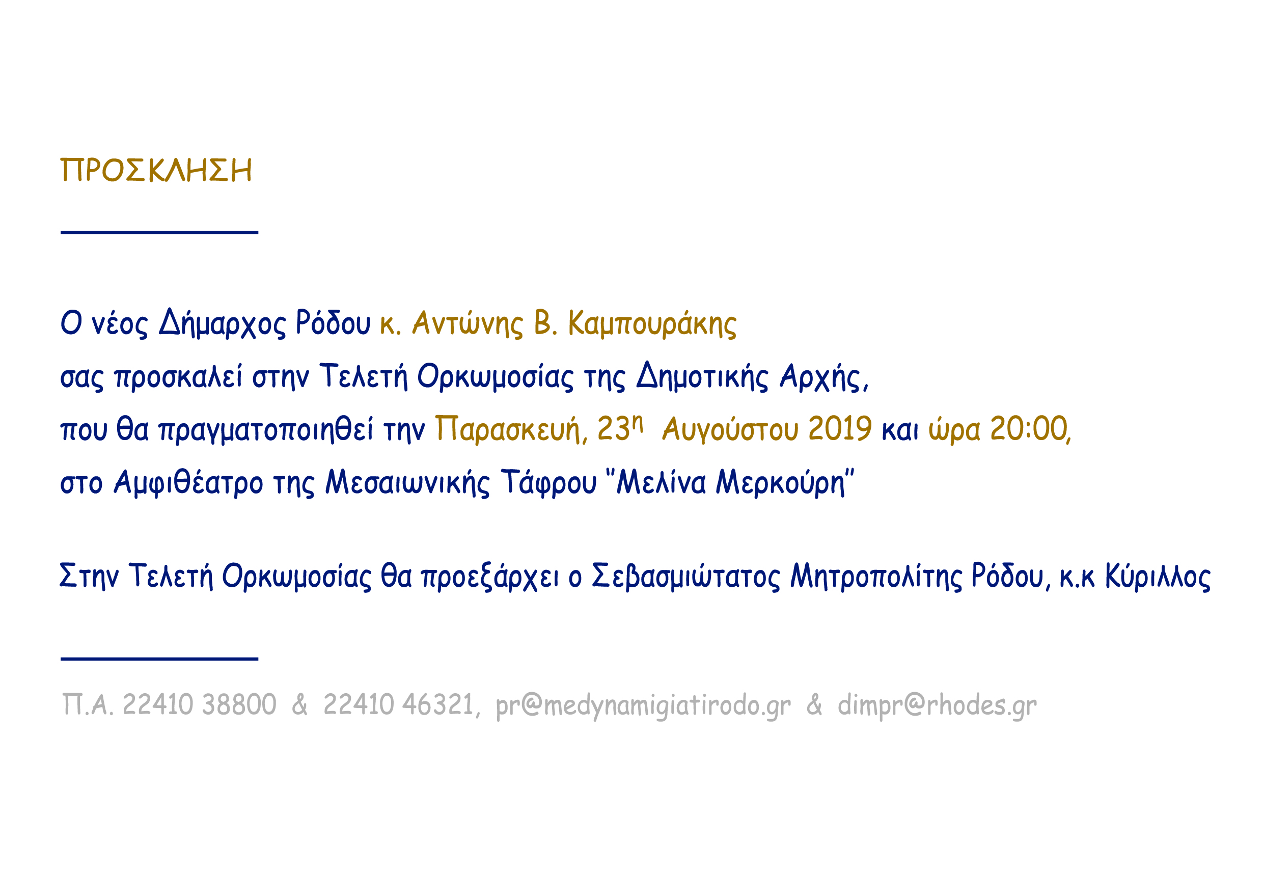 Μεθαύριο, Παρασκευή, 23 Αυγούστου, στις 8 το βράδυ στο Θέατρο της Μεσαιωνικής Τάφρου Ρόδου θα γίνει η ορκωμοσία του νέου δημοτικού συμβουλίου Ρόδου καθώς και των τοπικών συμβουλίων. Στην τελετή ορκωμοσίας θα προεξάρχει ο Μητροπολίτης Ρόδου Κύριλλος.