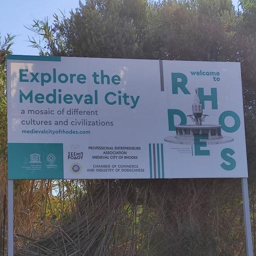 Δελτίο Τύπου-Πινακίδα υποδοχής των επισκεπτών μας τοποθετήθηκε έξω από το αεροδρόμιο μετα από πρωτοβουλία του ΣΕΕΜΠ με την χορηγία του Επιμελητηρίου Δωδεκανήσου. Σκοπός η προβολή της Μεσαιωνικής Πόλης μέσα από μια πιο σύγχρονη οπτική ως πολιτιστικό και εμπορικό κέντρο.