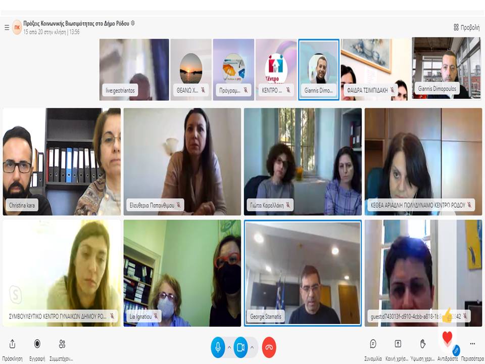 - Με επιτυχία πραγματοποιήθηκε το workshop παρουσίασης του Σχεδίου δράσης «Πράξεις Κοινωνικής Βιωσιμότητας στο Δήμο Ρόδου» του προγράμματος Στέγαση και Εργασία για Άστεγους του Υπουργείου Εργασίας και Κοινωνικών Υποθέσεων, που διοργάνωσε η Διεύθυνση Προγραμματισμού και Οργάνωσης του Δήμου Ρόδου, τη Δευτέρα 11 Απριλίου και ώρα 12:30 μέσω τηλεδιάσκεψης.