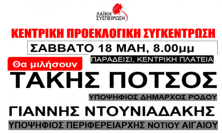 Δελτίο Τύπου-Προεκλογική Συγκέντρωση της Λαϊκής Συσπείρωσης στο Παραδείσι το Σάββατο 18 Μάη στις 8 το βράδυ.