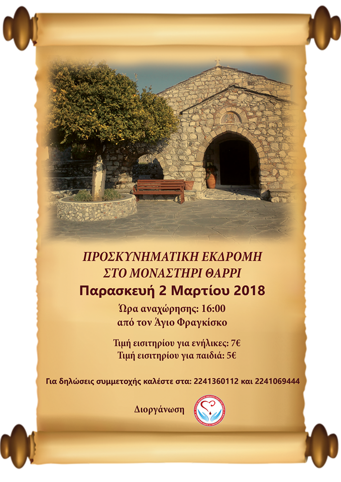 Ο Σύλλογος Εθελοντών Αιμοδοτών Ρόδου Άγιος Εφραίμ, σας προσκαλεί στην προσκυνηματική εκδρομή στο Θάρρι, την Παρασκευή 2 Μαρτίου 2018, για να παρακολουθήσουμε τους Β΄ Χαιρετισμούς.