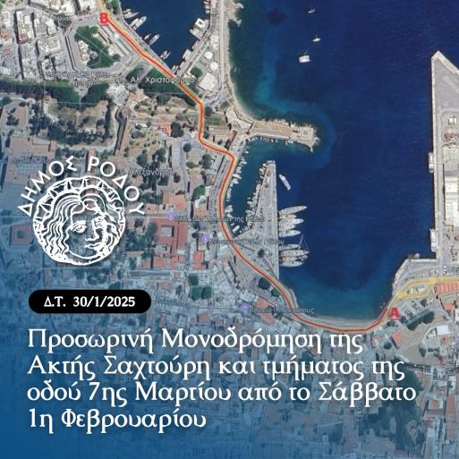 θα εφαρμοστεί από το Σάββατο 01 Φεβρουαρίου 2025 και ώρα 09:00 π.μ.η προσωρινή μονοδρόμηση της Ακτής Σαχτούρη και τμήματος της οδού 7ης Μαρτίουμε φορά κατεύθυνσης από τον Κεντρικό Λιμένα προς το Κέντρο της πόλης.