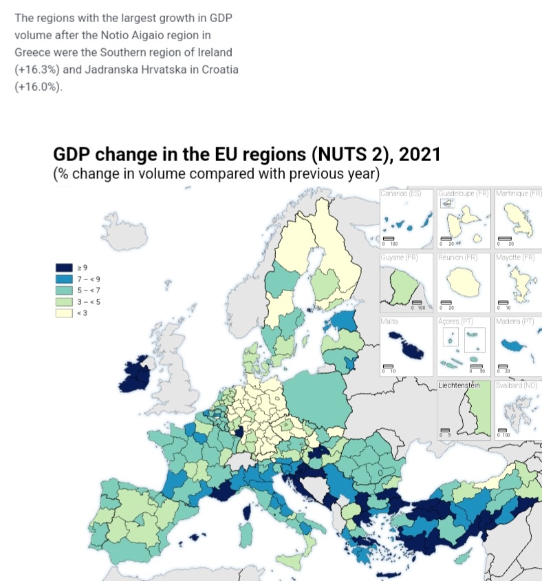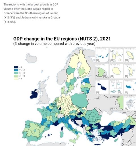 Συγκεκριμένα, η Περιφέρεια Νοτίου Αιγαίου, το 2021, πέτυχε ανάπτυξη 16,7% ενώ τη δεύτερη υψηλότερη ανάπτυξη σημείωσε η Νότια Περιφέρεια της Ιρλανδίας (16,3%) και την τρίτη μεγαλύτερη η περιφέρεια της Κροατίας Jadranska Hrvatska (16%).