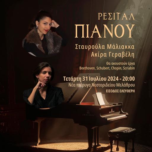 Η Διεύθυνση ΔΟΠΑΡ του Δήμου Ρόδου, με τη στήριξη του Μουσείου Νεοελληνικής Τέχνης Δήμου Ρόδου, πραγματοποιεί μια πιανιστική βραδιά όπου θα ακουστούν έργα των Schubert, Beethoven, Scriabin και Chopin, ερμηνευμένα από δύο νέες πιανίστες που έχουν τη χαρά να δώσουν το πρώτο τους ρεσιτάλ στον τόπο καταγωγής τους.