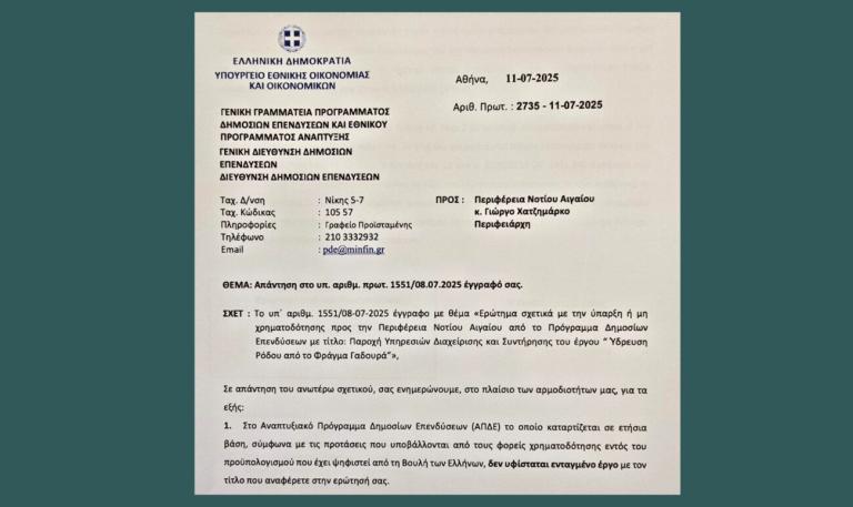 Με επίσημη απάντησή του προς την Περιφέρεια Νοτίου Αιγαίου, το Υπουργείο Εθνικής Οικονομίας και Οικονομικών, μέσω της αρμόδιας Γενικής Διεύθυνσης του Προγράμματος Δημοσίων Επενδύσεων, διευκρινίζει κατηγορηματικά ότι δεν υπάρχει ενταγμένο στο Πρόγραμμα Δημοσίων Επενδύσεων του Υπουργείου Εθνικής Οικονομίας & Οικονομικών το έργο με τίτλο «Παροχή Υπηρεσιών Διαχείρισης και Συντήρησης του έργου Ύδρευσης Ρόδου από το Φράγμα Γαδουρά».