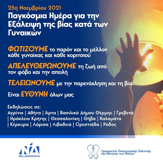 Για την Παγκόσμια Ημέρα για την Εξάλειψη της Βίας κατά των Γυναικών η Γραμματεία Οικογενειακής Πολιτικής & Ισότητας των Φύλων ΝΔ οργανώνει δράση σε 14 πόλεις της Ελλάδας ώστε ώστε να εκπέμψει το μήνυμα της υποχρέωσης όλων μας να διώξουμε τον φόβο από τις ψυχές των γυναικών και κοριτσιών και να αγωνιστούμε για το δικαίωμά τους στη ζωή, την ελευθερία και την αξιοπρέπεια.