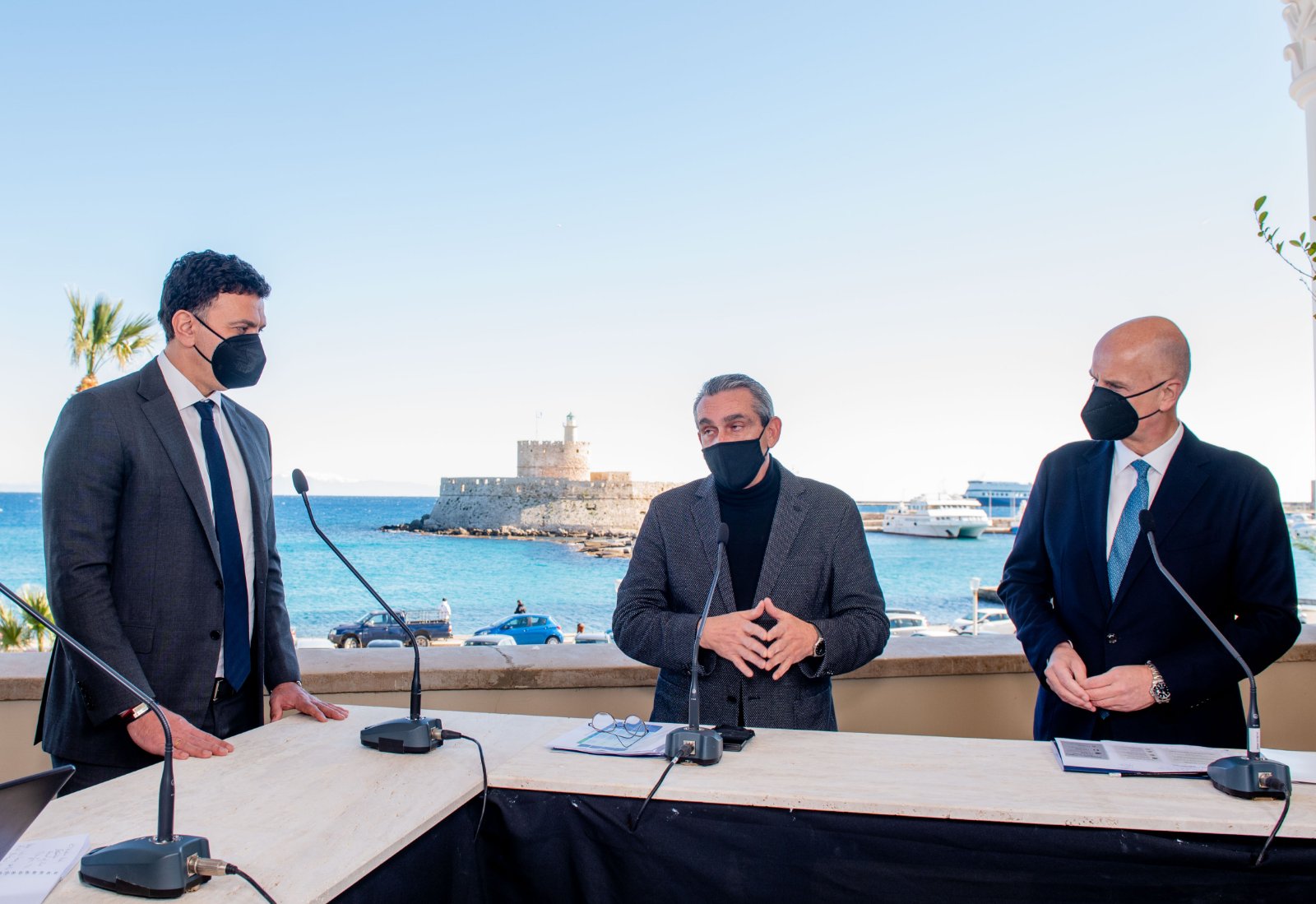 Οικοδεσπότης της συνέντευξης Τύπου, ο Περιφερειάρχης Νοτίου Αιγαίου, Γιώργος Χατζημάρκος, που υποδέχθηκε στο μπαλκόνι του κτηρίου της Περιφέρειας με θέα το Μανδράκι, τον Υπουργό Τουρισμού, Βασίλη Κικίλια, τον Διευθύνοντα Σύμβουλο του ομίλου TUI GroupFritz Joussen και τον Πρόεδρο του ιδρύματος TUI Care Foundation Thomas Ellerbeck για να «συναντήσουν» διαδικτυακά τους εκπροσώπους των διεθνών ΜΜΕ και να δώσουν απαντήσεις στα ερωτήματά τους σχετικά με την πρωτοβουλία για τη βιώσιμη ανάπτυξη του τουριστικού προορισμού της Ρόδου.