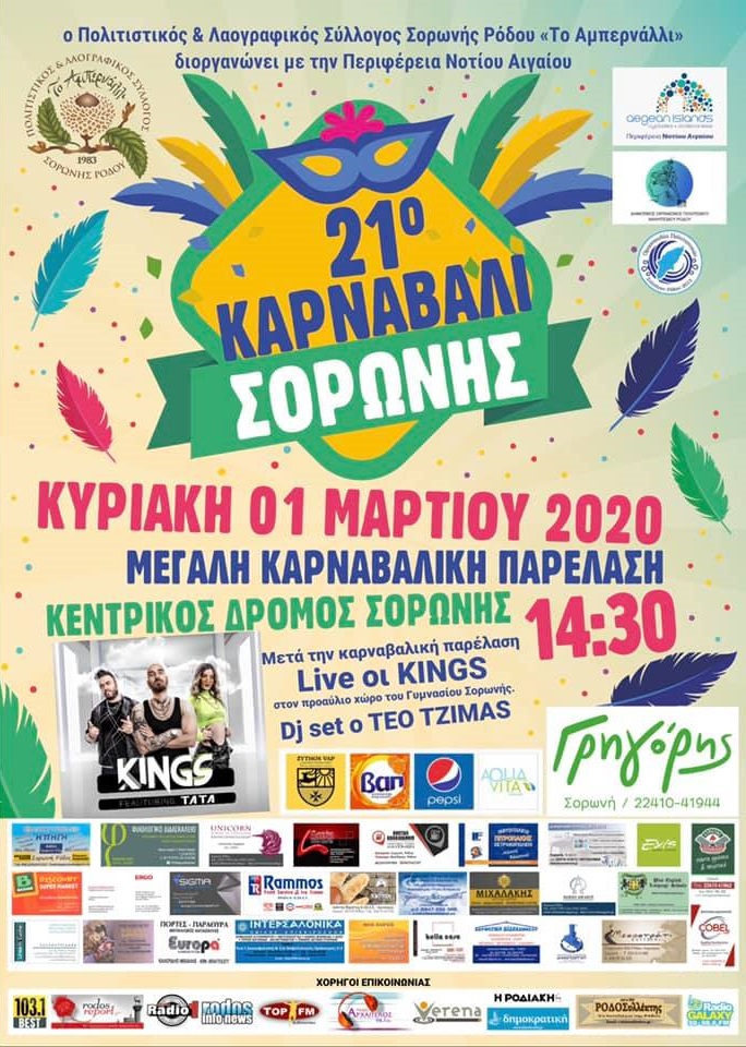 Δελτίο Τύπου-Στην τελική ευθεία βρίσκονται οι ετοιμασίες για το 21ο Καρναβάλι Σορωνής. Διοργανωτής ο Πολιτιστικός και Λαογραφικός Σύλλογος Σορωνής Ρόδου ‘Το Αμπερνάλλι’ σε συνδιοργάνωση με την Περιφέρεια Νοτίου Αιγαίου.