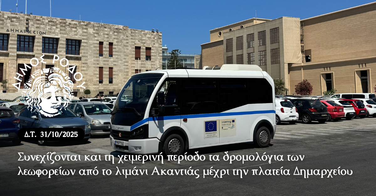 Από τη Διεύθυνση Συγκοινωνίας Δήμου Ρόδου ανακοινώνεται ότι τα δρομολόγια των λεωφορείων από το λιμάνι Ακαντιάς μέχρι την πλατεία Δημαρχείου και αντίστροφα θα συνεχιστούν και τη χειμερινή περίοδο και θα τεθούν σε ισχύ από τη Δευτέρα 3 Νοεμβρίου.