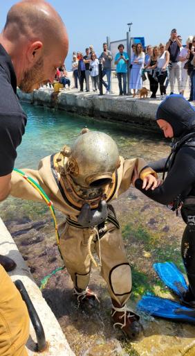Εντυπωσιακή η παρουσία του Συλλόγου Αυτοδυτών Καλύμνου, μέλος του οποίου, η Ζηνοβία Εργά, η πρώτη γυναίκα δύτης στην Ελλάδα τον 21ο αιώνα  παρουσίασε πραγματική κατάδυση, φορώντας το σκάφανδρο και κουβαλώντας 90 κιλά επί πλέον βάρος. Η Αναστασία Κάτρη, εκπαιδεύτρια,  καταδύθηκε με φιάλες οξυγόνου για  βιντεοσκόπηση, ενώ ο εκπαιδευτής κ. Κουμπάρος  είχε τον απόλυτο συντονισμό της κατάδυσης.