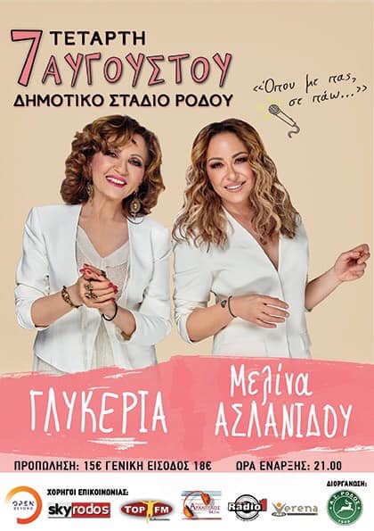 Στις 7 Αυγούστου όλοι οι δρόμοι οδηγούν στο Δημοτικό Στάδιο της Ρόδου, ώρα 21:00 παρέα με την Μελίνα Ασλανίδου και την Γλυκερία σας περιμένουμε για μία αξέχαστηβραδιά!