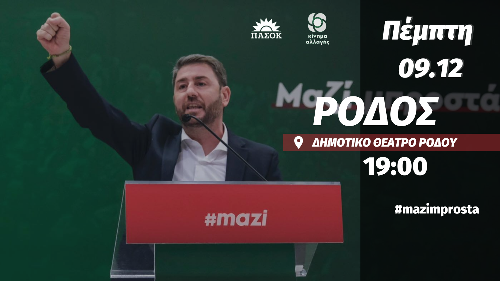 - Πρώτο ραντεβού την Πέμπτη 9/12, 7μ.μ. στο Δημοτικό Θέατρο Ρόδου, ομιλία του υποψήφιου προέδρου και Ευρωβουλευτή του Κινήματος Αλλαγής, Νίκου Ανδρουλάκη.
