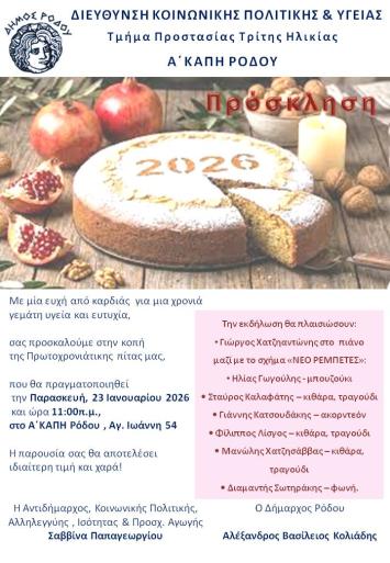 Το ΚΑΠΗ Δήμου Ρόδου, θα πραγματοποιήσει την κοπή της Πρωτοχρονιάτικης του πίτας την Παρασκευή 23 Ιανουαρίου 2026 ώρα 11 το πρωί, στον χώρο του, στην οδό Αγίου Ιωάννου 54, παρουσία του Σεβασμιότατου Μητροπολίτη Ρόδου κ.κ. Κυρίλλου και της αντιδημάρχου Κοινωνικής Πολιτικής, Αλληλεγγύης, Ισότητας και Προσχολικής Αγωγής Σαββίνας Παπαγεωργίου.