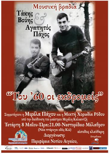Αφηγούνται και τραγουδούν τα πρώτα βήματα της πετυχημένης και σημαντικής καλλιτεχνικής τους πορείας. Δύο καλλιτέχνες ιδιαίτερα αγαπητοί στην Ρόδο και όχι μόνο που υπηρέτησαν και εξακολουθούν να υπηρετούν το ελληνικό τραγούδι με συνέπεια και δημιουργική διάθεση. Θα ερμηνεύσουν αγαπημένα τραγούδια της δεκαετίας του ’60 που σημάδεψαν τα δικά τους πρώτα βήματα και διαμόρφωσαν σε μεγάλο βαθμό την εξέλιξη τους. Τραγούδια, μεγάλες επιτυχίες, που αγαπήθηκαν ιδιαίτερα από το κοινό.