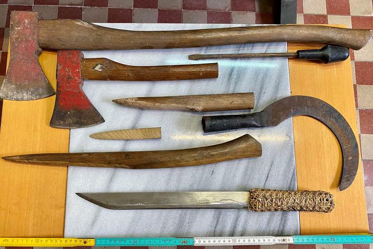 - Κατασχέθηκαν 2 τσεκούρια, δρεπάνι, αυτοσχέδια αιχμηρά αντικείμενα-όπλα και το μαχαίρι που χρησιμοποίησε