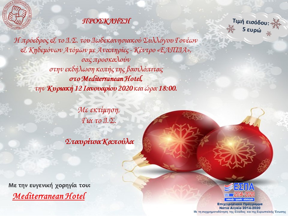 ΔΩΔΕΚΑΝΗΣΙΑΚΟΣ ΣΥΛΛΟΓΟΣ ΓΟΝΕΩΝ ΚΑΙ ΚΗΔΕΜΟΝΩΝ ΑΤΟΜΩΝ ΜΕ ΑΝΑΠΗΡΙΑ. ΚΕΝΤΡΟ ΔΙΗΜΕΡΕΥΣΗΣ-ΗΜΕΡΗΣΙΑΣ ΦΡΟΝΤΙΔΑΣ ΑΤΟΜΩΝ ΜΕ ΝΟΗΤΙΚΗ ΥΣΤΕΡΗΣΗ "ΕΛΠΙΔΑ"