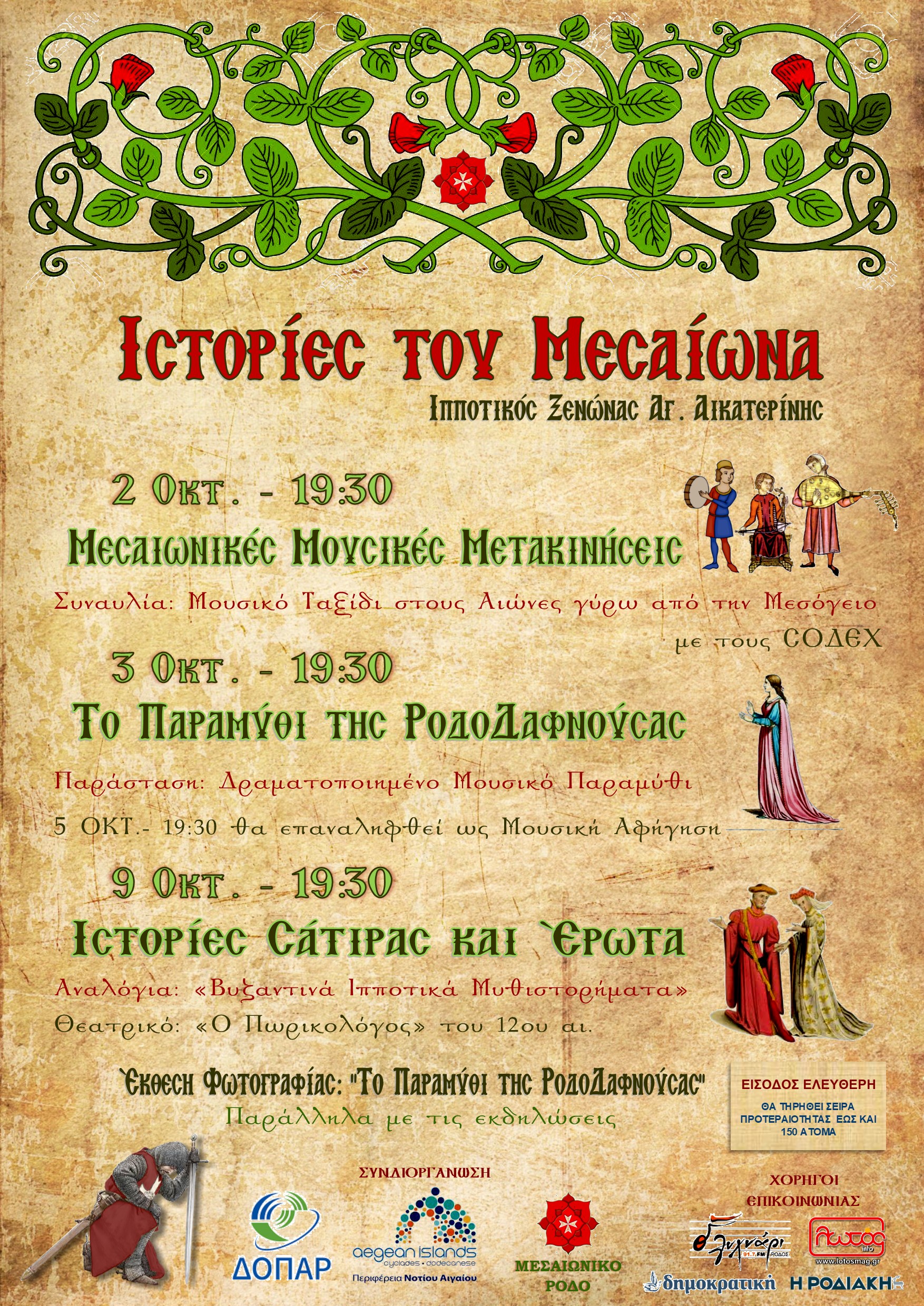 Μία σειρά εκδηλώσεων, με μουσική, θέατρο και αφηγήσεις θα πραγματοποιηθεί στον Ιπποτικό Ξενώνα Αγίας Αικατερίνης, υπαίθριο αμφιθέατρο - Μεσαιωνική Πόλη Ρόδου (πλατεία Αγίου Παντελεήμονα)