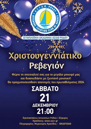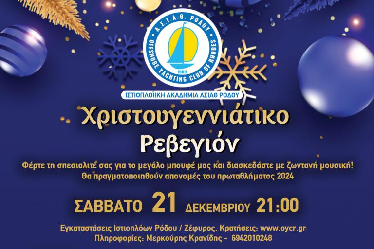 Το Σάββατο 21 Δεκεμβρίου 2024 θα πραγματοποιηθεί το Χριστουγεννιάτικο Ρεβεγιόν του Αθλητικού Συλλόγου Ιστιοπλόων Ανοικτής Θάλασσας Ρόδου (ΑΣΙΑΘΡ). Θα γίνει στις εγκαταστάσεις των ιστιοπλόων Ρόδου, στην περιοχή Ζέφυρος και θα αρχίσει στις 9μ.μ.