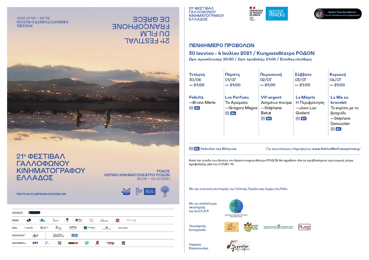 Με ιδιαίτερη ικανοποίηση ανακοινώνουμε στους φίλους του κινηματογράφου στο νησί μας, πως ο Όμιλός μας, στο πλαίσιο μιας γόνιμης συνεργασίας με το Γαλλικό Ινστιτούτο, θα προβάλλει στη Ρόδο πέντε ταινίες οι οποίες είχαν συμπεριληφθεί στο πρόγραμμα του «21ου Φεστιβάλ Γαλλόφωνου Κινηματογράφου Ελλάδος». Το Φεστιβάλ πραγματοποιήθηκε διαδικτυακά κατά το χρονικό διάστημα 6-14 Απριλίου 2021 και έχει ως στόχο τη διάδοση του γαλλικού πολιτισμού στην Ελλάδα.