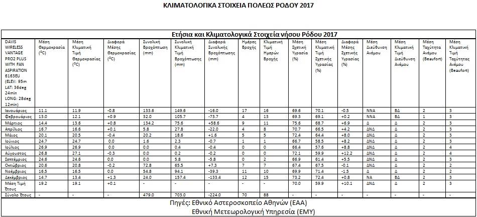 ΜΕ ΦΥΣΙΟΛΟΓΙΚΕΣ ΘΕΡΜΟΚΡΑΣΙΕΣ ΑΛΛΑ ΛΙΓΟΤΕΡΕΣ ΒΡΟΧΟΠΤΩΣΕΙΣ ΚΥΛΗΣΕ ΤΟ 2017 ΣΤΗΝ ΠΟΛΗ ΤΗΣ ΡΟΔΟΥ Γράφει ο Σεραφείμ Χριστοδούλου: Πτυχιούχος Περιβαλλοντολόγος (με κατεύθυνση Μετεωρολογίας) και συνεργάτης του Εθνικού Αστεροσκοπείου Αθηνών Σημαντικά και άξια προβληματισμού τα στοιχεία που παρέχονται στον πίνακα των κλιματολογικών συνθηκών πόλεως Ρόδου για το 2017. Η μέση ετήσια θερμοκρασία διαμορφώθηκε στους 19.2 °C. Έτσι το 2017 χαρακτηρίζεται ότι ήταν σε φυσιλογικά θερμοκρασιακά επίπεδα (μόνο +0.1 °C θερμότερο σε σχέση με τις κλιματικές τιμές). Ο μήνας με την μεγαλύτερη θετική απόκλιση ήταν ο Δεκέμβριος όπου ήταν +1.3 °C θερμότερος σε σχέση με το φυσιολογικό, λόγω των Νοτιονατολικών ανέμων που επικράτησαν. Αντίθετα, ο μήνας με την μεγαλύτερη αρνητική απόκλιση ήταν ο Ιανουάριος που ήταν ψυχρότερος κατά 0.8 °C. Οι βροχοπτώσεις το 2017 χαρακτηρίζονται μέτριες και αυτό συμβάλει στον ουσιαστικό εμπλουτισμό των υδροφόρων οριζόντων του νησιού, καθώς δεν παρατηρήθηκε αυξημένη επιφανειακή απορροή που ωθεί το νερό στην θάλασσα. Επίσης παρατηρείται μεγάλη ανομοιογενής κατανομή των βροχοπτώσων μέσα στο τρίμηνο Ιανουαρίου-Φεβρουαρίου- Μαρτίου. Η συνολική βροχόπτωση του έτους ήταν 479.0 mm καταγράφοντας απώλειες 240.0 mm σε σχέση με την αναμενόμενη για το κλίμα της Ρόδου τιμή (ποσοστό της τάξης του 38.2%). Ο μήνας με θετικό πρόσημο από πλευράς βροχής ήταν ο Μάρτιος με 58.6 mm περισσότερης βροχόπτωσης που οφείλεται πιθανόν στους πιο εξασθενημένους ανέμους κατά 1 Beaufort από Δυτικές διευθύνσεις που επικράτησαν την περίοδο εκείνη στο νησί. Προβληματισμό προκαλεί η εμμονή του Δεκεμβρίου τα τελευταία 3 χρόνια να καταγράφει τεράστιες απώλειες υετού που το 2017 ήταν 133.4 mm (το 84.7% χάθηκε) παρόλο που επικράτησε Νοτιοανατολίκος άνεμος (άκρως βροχερός άνεμος για το νησί της Ρόδου). Αυτή η απώλεια μπορεί να αποδοθεί στην αυξημένη σχετική υγρασία σε σχέση με τις κλιματολογικές τιμές εκείνο τον μήνα. Εξετάζοντας από το2013, παρατηρούμε, και από τα σχετικά διαγράμματα, ότι μετά από μια σημαντική πτώση των ποσοτήτων βροχής το 2017 υπάρχει μια μικρή αύξηση. Μια αύξηση της τάξης του 26.9% σε σχέση με το 2016 που ήταν το έτος με την λιγότερη βροχόπτωση. Η μέση ετήσια θερμοκρασία για την συγκεκριμένη χρονική περίοδο παρουσιάζει μια πτωτική τάση των περίπου 0.3 °C ανά χρόνο, σε αντίθεση με την γενικότερη θέρμανση που παρατηρείται σε πλανητικό επίπεδο (κατά περίπου 1 °C) απόρροια της κλιματικής αλλαγής. Για το επόμενο διάστημα προβλέπεται να παίρνουν το «πάνω χέρι» οι νοτιάδες δίνοντας βροχές μέχρι και τις 4 Ιανουαρίου 2018. Για τα Θεοφάνεια ο καιρός φαίνεται να είναι αίθριος διευκολύνοντας τις εκδηλώσεις, με την θερμοκρασία επιφανείας της θάλασσας να είναι στους 19 °C αυτήν την εποχή. Οι άνεμοι θα είναι μέτριοι και μόνο στις 05/01/2018 θα είναι πολύ ισχυροί. Η θερμοκρασία θα παρουσιάσει σταδιακή πτώση. Μια διαφαινόμενη άνοδος της θερμοκρασίας αναμένεται από τις 06/01/2018. Σας εύχομαι καλή χρονιά, γεμάτη υγεία, αγάπη και ευτυχία.