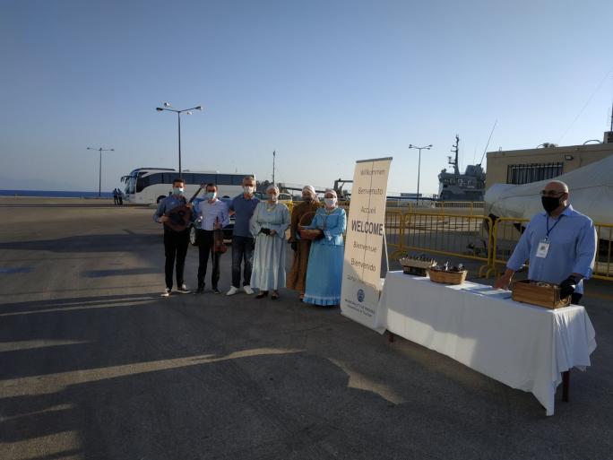 Παρόντες στην υποδοχή ήταν οι ναυτιλιακοί πράκτορες Τσαμπίκος Χατζημιχάλης και Τώνια Χατζημιχάλη, του πρακτορείου “Carayanides Travel Service SA” .
