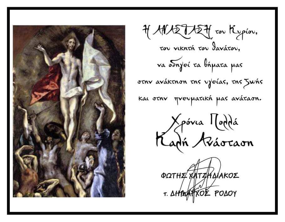 Η Ανάσταση του Κυρίου, του νικητή του θανάτου, να οδηγεί τα βήματα μας στην ανάκτηση της υγείας, της ζωής και στην πνευματική μας ανάταση. Αυτό είναι το πασχαλινό μήνυμα του τεως δημάρχου Ρόδου Φώτη Χατζηδιάκου προς τον Ροδιακό λαό.