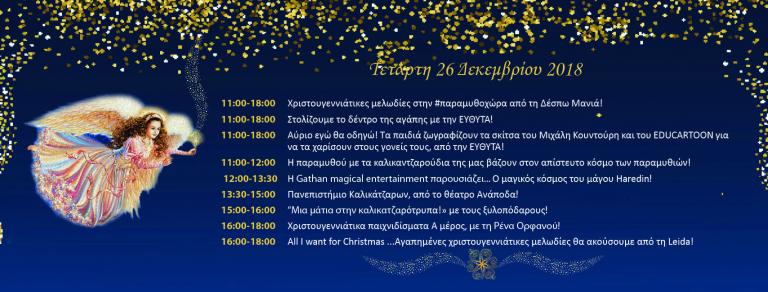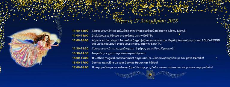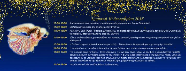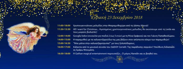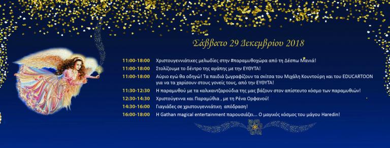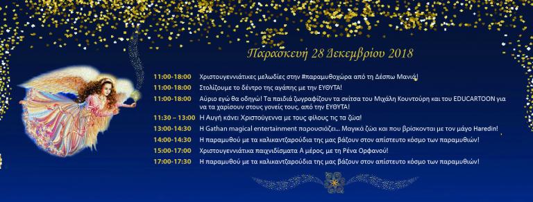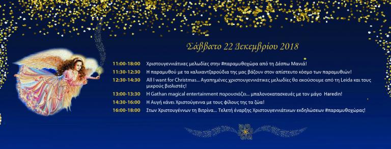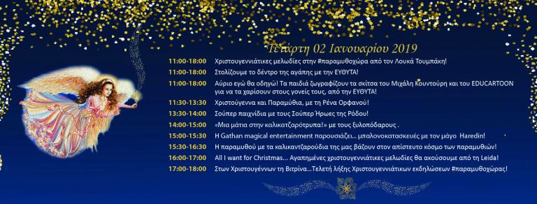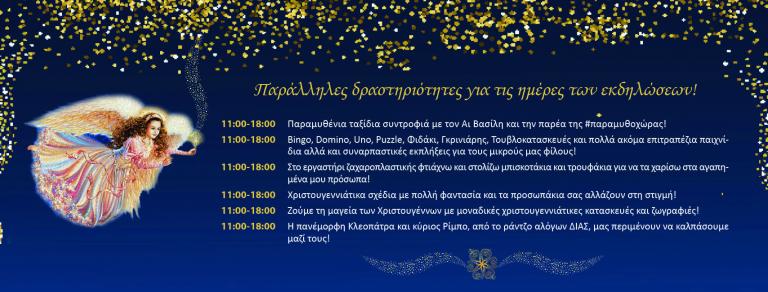 Στις εορταστικές εκδηλώσεις θα πραγματοποιηθούν πάνω από 50 ώρες πολιτιστικών εκδηλώσεων, τις 8 μέρες που θα λειτουργήσει η παραμυθοχώρα. Οι δράσεις περιλαμβάνουν μουσικές και χορευτικές παραστάσεις, μουσικο- εκπαιδευτικά προγράμματα, διαδραστικές εκδηλώσεις και παιχνίδια για τα παιδιά, ξυλοπόδαρους και ήρωες αγαπημένων παραμυθιών, Αι Βασίλη, μάγους και ταχυδακτυλουργούς, ειδικά διαμορφωμένη κουζίνα για παιδική μαγειρική, το δέντρο της αγάπης από την ΕΥΘΥΤΑ και πολλές άλλες παράλληλες δραστηριότητες, με κεντρικό σύνθημα, «Μαζί ζωντανεύουμε τα παραμύθια». Τιμή εισόδου 3€