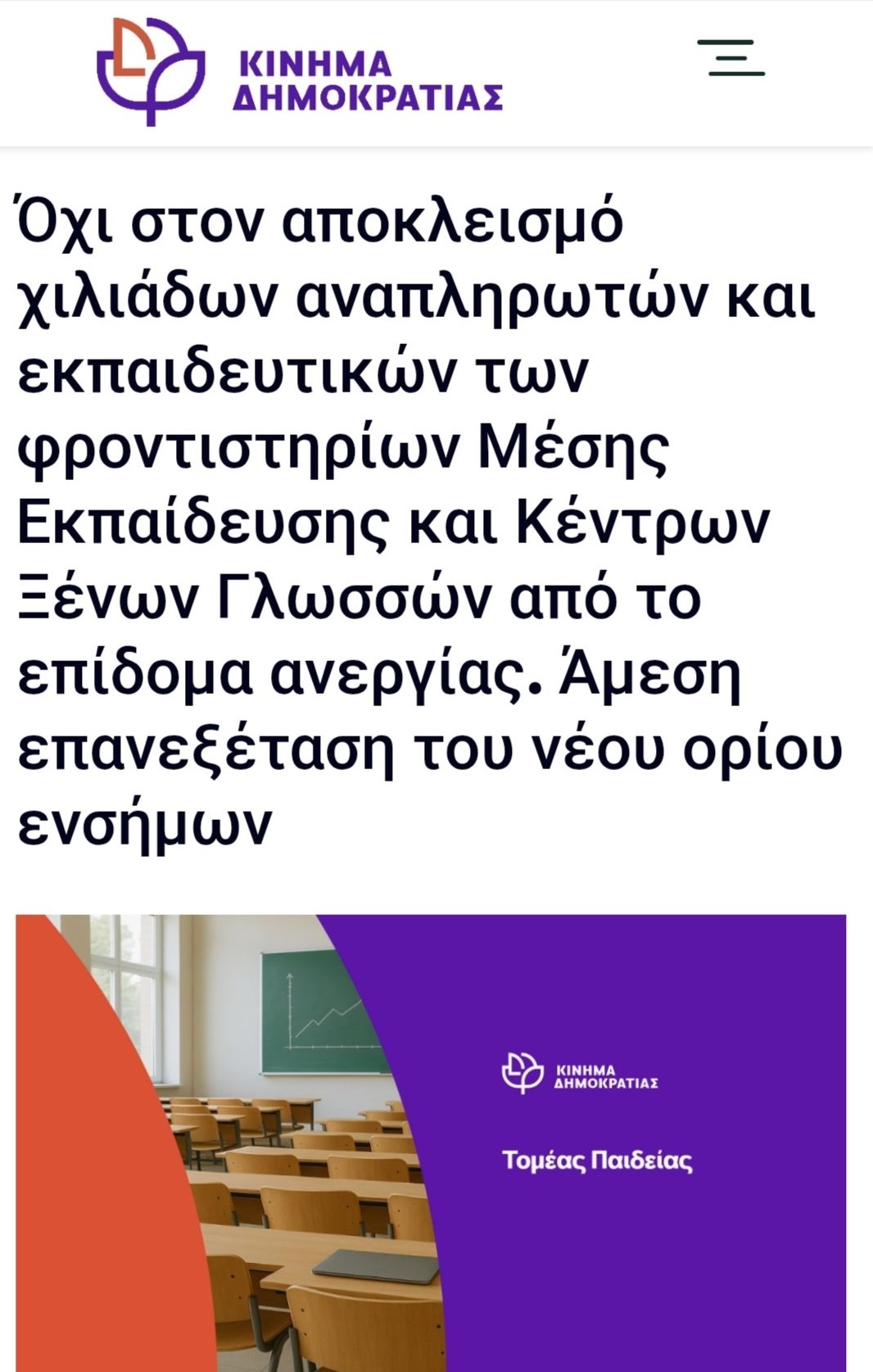 Το Κίνημα Δημοκρατίας εκφράζει την έντονη διαμαρτυρία του για τον αποκλεισμό χιλιάδων αναπληρωτών/-τριών και εκπαιδευτικών που εργάζονται σε φροντιστήρια Μέσης Εκπαίδευσης και Κέντρα Ξένων Γλωσσών από τη δυνατότητα λήψης επιδόματος ανεργίας -κατά τους θερινούς μήνες- εξαιτίας της αύξησης του ορίου των απαιτούμενων ενσήμων από 125 σε 175 κατ' έτος. Η ρύθμιση αυτή που αφορά το σύνολο των εργαζομένων θα εφαρμοστεί πιλοτικά για φέτος, ωστόσο αναμένεται το επόμενο χρονικό διάστημα να ψηφιστεί νομοθετική ρύθμιση για την καθολική εφαρμογή της.